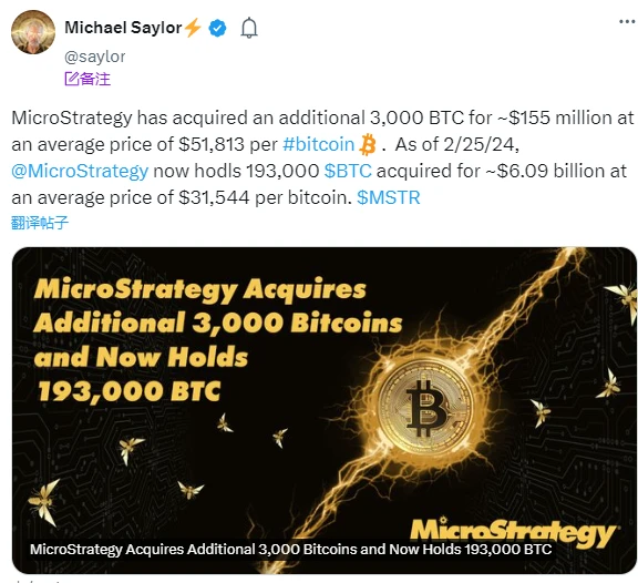 2 月 13 日,MicroStrategy 首席执行官 Michael Saylor 接受 CNBC 采访时表示, 比特币现货 ETF 的购买需求远大于矿企的供应量,将购入更多比特币 。