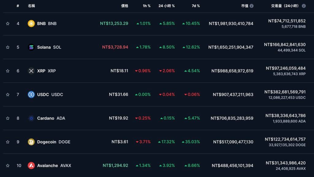 CoinMarkeCap 数据 显示 ,前十大币种近 24 小时多数上涨,狗狗币(DOGE)涨幅最大达 17.32%,其他代币如:BNB、SOL、AVAX 也分别有 4~8% 的涨幅。