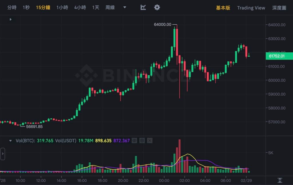 比 特币昨晚一路高歌猛进,接连突破多道重要价格关卡,并在今(29)日 01˙:15 左右一度触及 64,000 美元,单日最大涨幅高达 13%,距离前高仅剩下 5,000 美元。