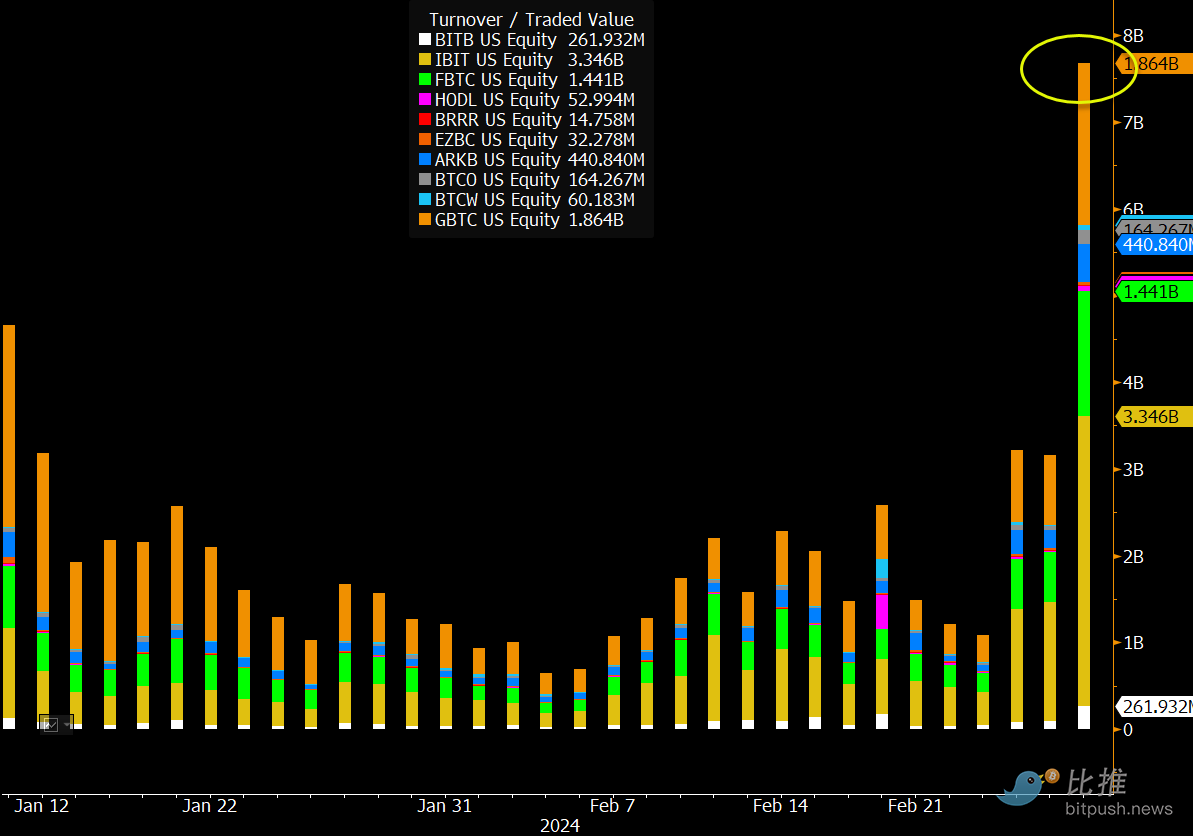 贝莱德的比特币 ETF( IBIT)成交量约 33 亿美元。富达 FBTC 成交量约为 14 亿美元。灰度 GBTC 成交量为 18 亿美元。