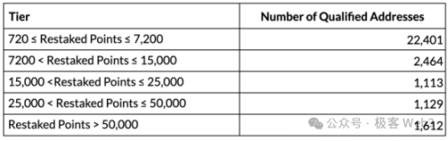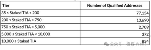 Altlayer 空投时采用了分层制,积分分发参考了用户在 Celestia 主网质押的 TIA 金额,进行了明确层级划分,你能获得的空投金额,按照你过去在 Celestia 等网络中质押的存款数额来定,不是看你有多少个账户。但是,单个账户的空投份额还是有限,满足了存款的最低金额后,才能获得奖励,奖励的下限和上限都有明确规定。这本质上是把激励分层化的 POS。