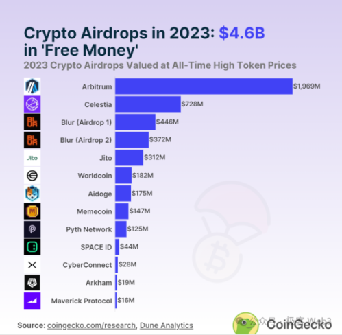 正文:尽管 2023 年是刺骨寒的熊市,很多项目方还是向用户分发了大规模的空投奖励。熊市中的 FreeMoney 让用户们趋之若鹜,仅以 Coingecko 的数据为例,以空投 Token 的 ATH(alltime 最高点)价格计算,仅过去一年中,Arbitrum 和 Celestia、Blur 等项目方就向用户分发了大约 46.5 亿美元的空投。
