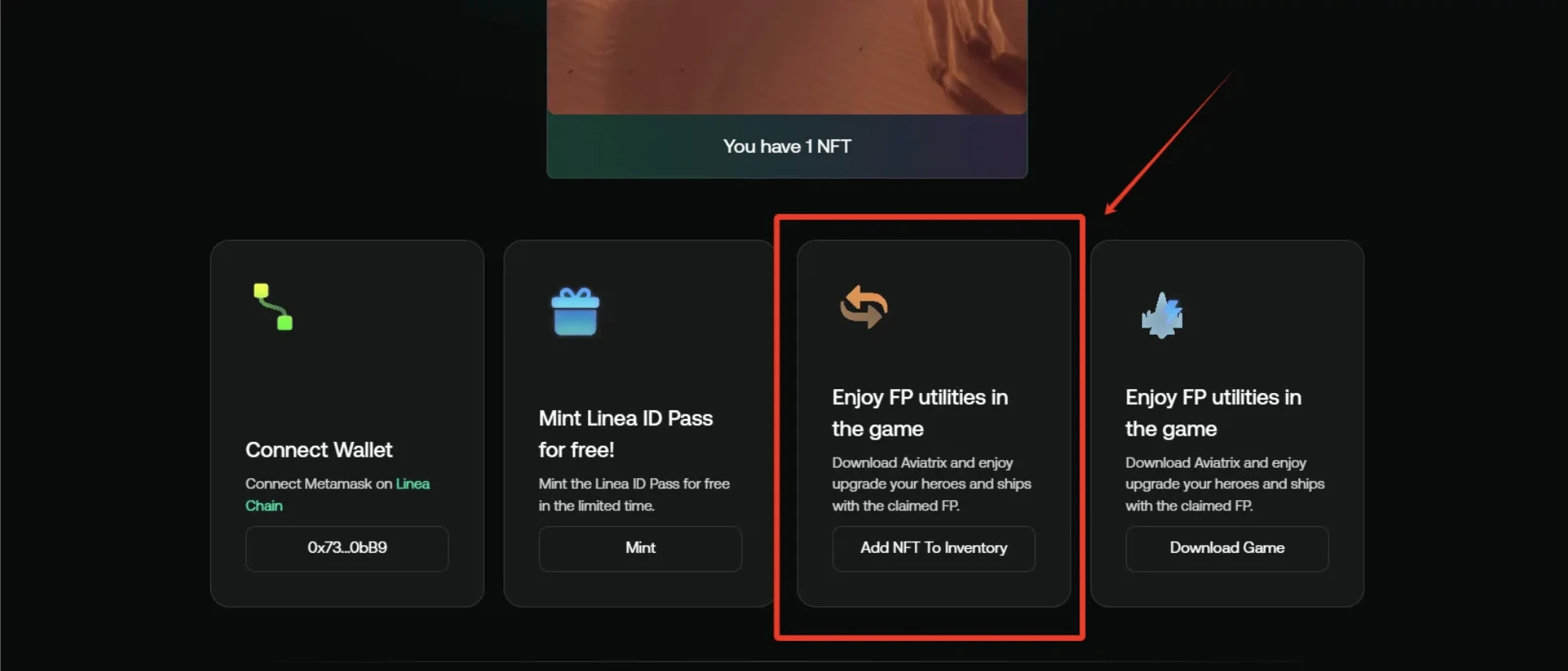 其次需要去质押刚刚 Mint 的 NFT,首先先登陆页面,点击 Add NFT To Inventory,钱包确定即可。