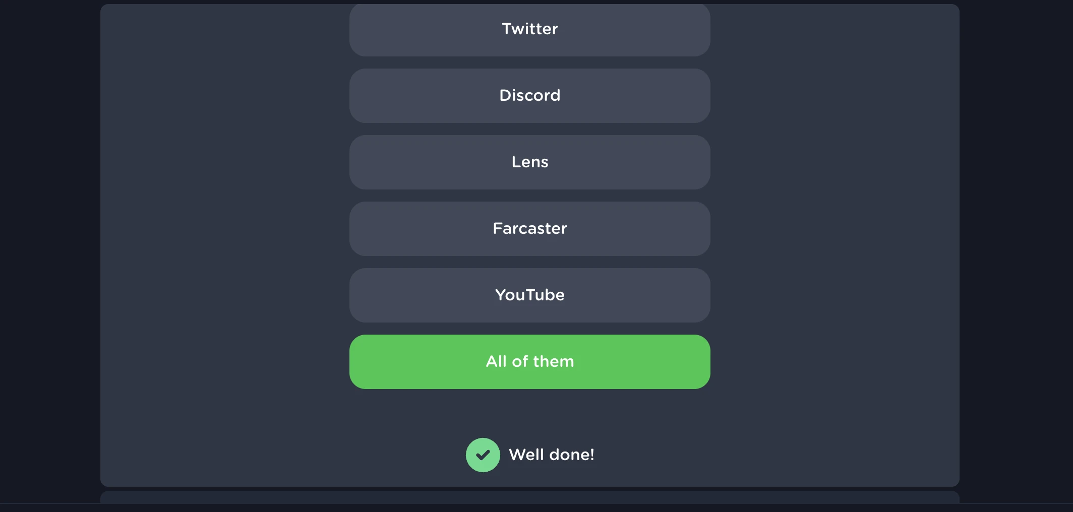 进行关注推特和问答等基础问题,按照流程去做就可以获得对应的 LXP。前两道关于获取渠道的题目都选择「All of them」。