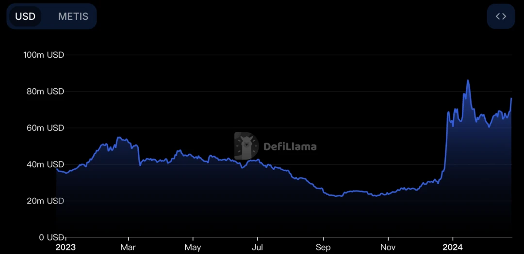 Metis 目前的 TVL 是$ 82.82 M,从上述 Metis TVL 自 2023 年起的变化中,我们可以看出自从 2024 Metis 推出去中心化排序器的设计后,链上 TVL 有了显著的增长,证明了社区和市场对于这一方向的看好。
