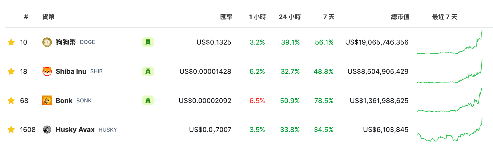 或受狗狗币拉涨影响,各公链的狗系迷因币称呈现暴涨。柴犬币 SHIB 飙涨 32.7%,市值挤进前 20 大币种;Solana 链上的迷因币 BONK 涨幅更是惊人,爆拉 50.9%;Avalanche 上的 Husky Avax 也不逊色,上涨 33.8%。