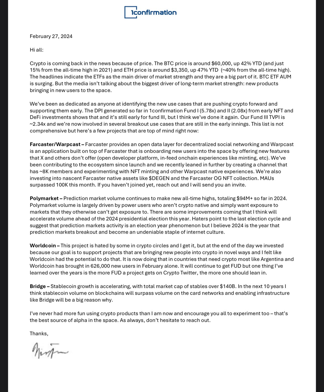 博链财经BroadChain获悉,3月1日,1confirmation创始人 Nick Tomaino发布一季度 LP letter。