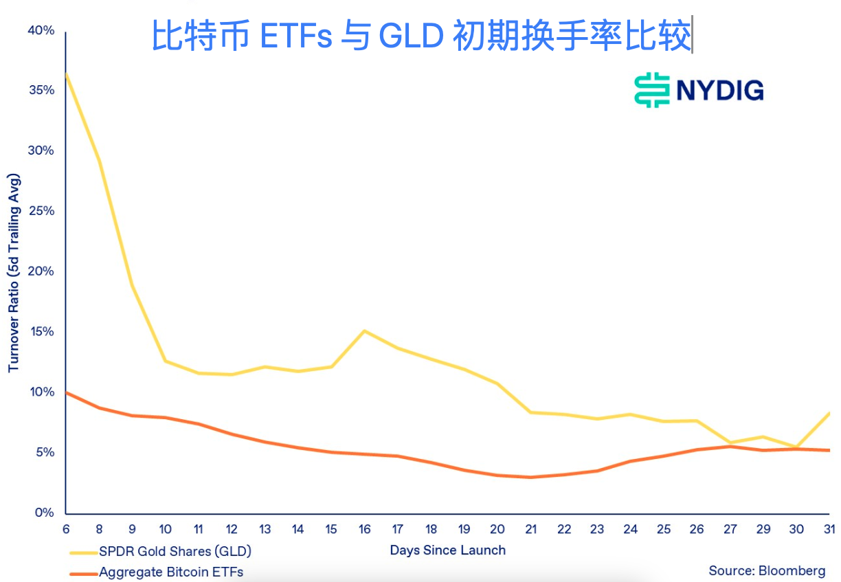 比特币 ETF 换手率高于黄金 ETF,年龄可能是关键