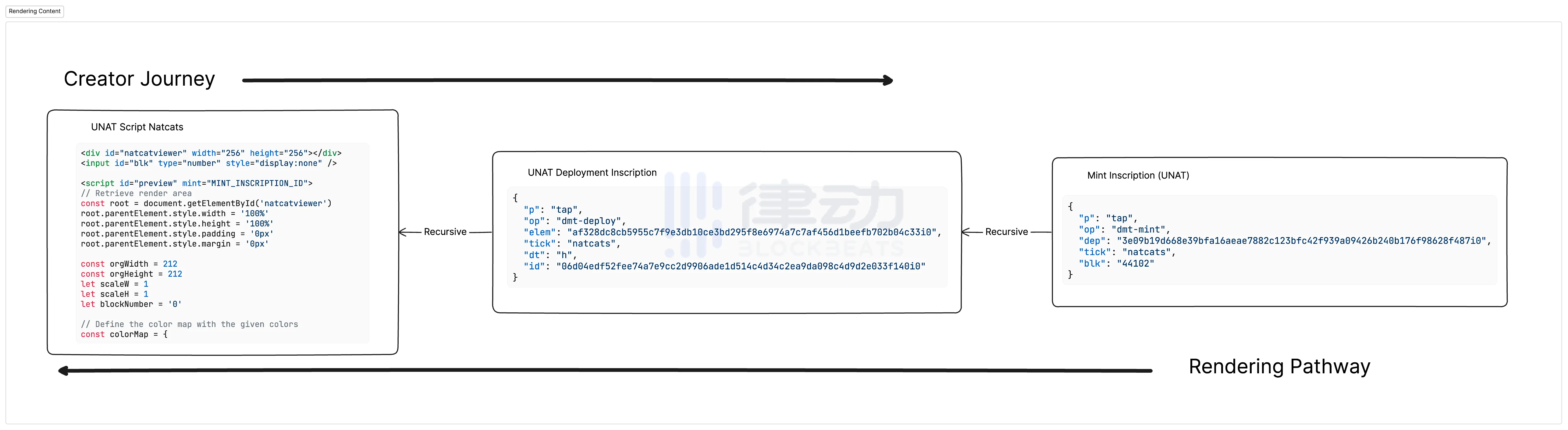 上图从左到右分别是渲染 Natcats 图像的渲染代码(以 JavaScript 形式刻录到了链上)、Natcats 部署铭文以及 Natcats 铸造铭文。铸造铭文中的「dep」字段指向部署铭文,而部署铭文中的「id」字段又指向了包含图像渲染代码的链上铭文。