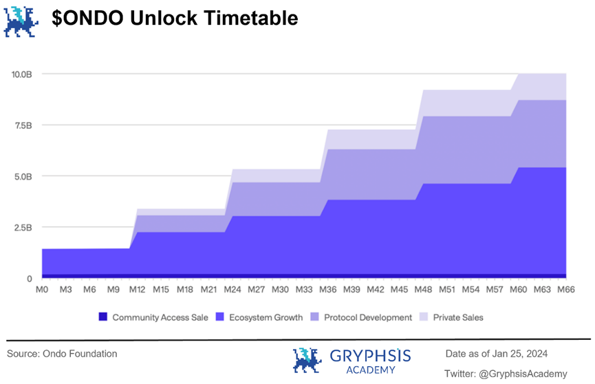 根据 Ondo Foundation 的提案,超过 85% 的 $ONDO 代币将被锁定,锁定的代币将在初始代币解锁后 12、 24、 36、 48 和 60 个月解锁。其中私募投资者和项目团队都将被锁定至少 12 个月,并在接下来的 4 年内解锁。通过 CoinList 参与 ICO 的投资者已于 2024 年 1 月 18 日全部解锁。