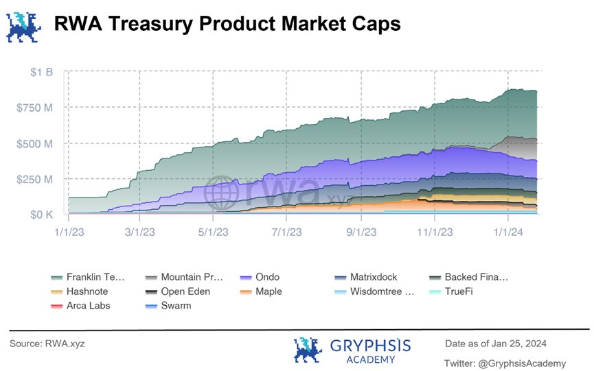 根据 RWA.xyz 的数据,RWA 美国国债的总市值在 2023 年 1 月 1 日仅为 1.14 亿美元,而在 2024 年 1 月 25 日已达到 8.55 亿美元,仅一年时间增长了 6 倍之多(且上述金额未计算 MakerDAO 使用 20 多亿美元的美债作为 $DAI 的抵押品)。
