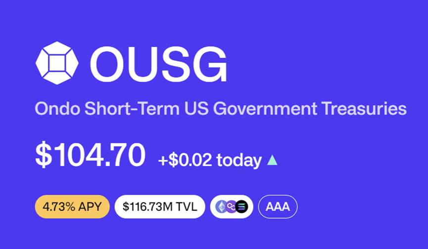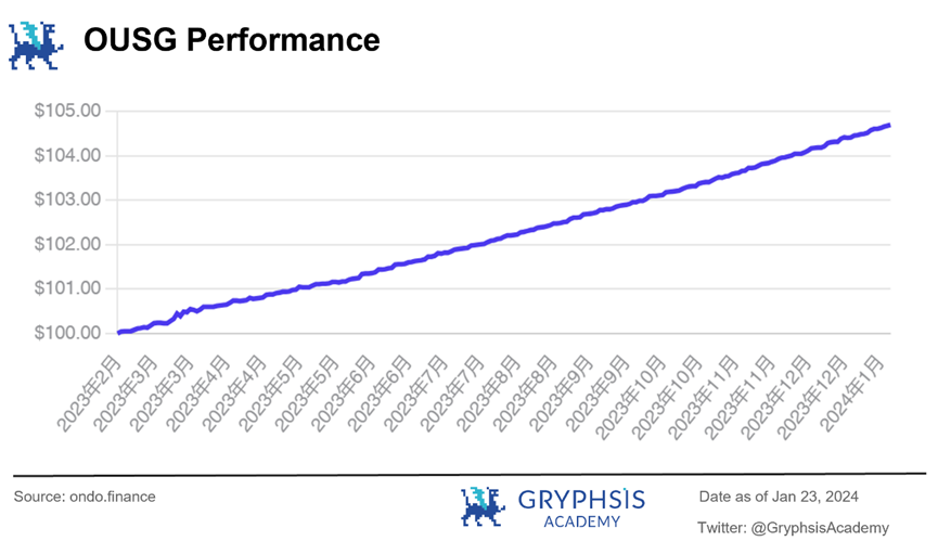 OUSG 自 2023 年 2 月发行以来,随着收益的实现价格持续走高,目前价格为 1 OUSG = 104.70 美元。