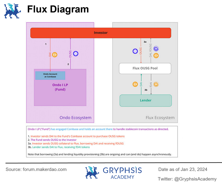 由于监管合规的原因,Ondo 的部分产品只能面向 KYC 许可客户。因此 Ondo 与后端 DeFi 协议 Flux Finance 开展合作,为 OUSG 等需许可投资的代币提供稳定币抵押借贷业务,实现协议后端的无许可参与。
