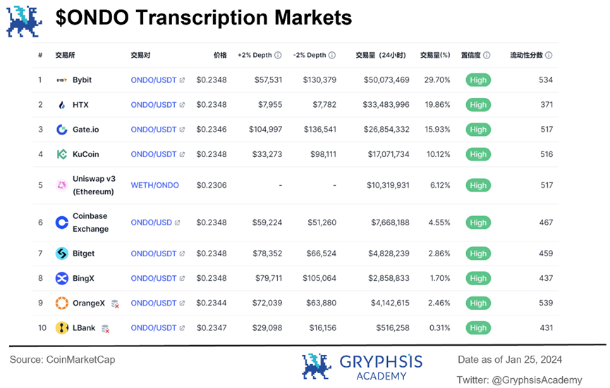 根据 CoinMarketCap 的数据,$ONDO 的主要交易场所为 Bybit、HTX 和 Gate.io,具体分布如下: