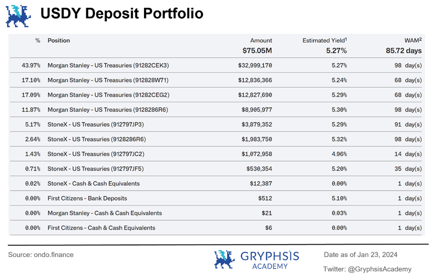 USDY 提供的年化收益率(APY)由 Ondo 每月根据实际情况调整。截至 2024 年 1 月 23 日,USDY 的 APY 为 5.10% 。其中底层资产(即美国国债和银行存款的投资组合)的 APY 约为 5.27% ,Ondo 收取的费用为 0.17% 。