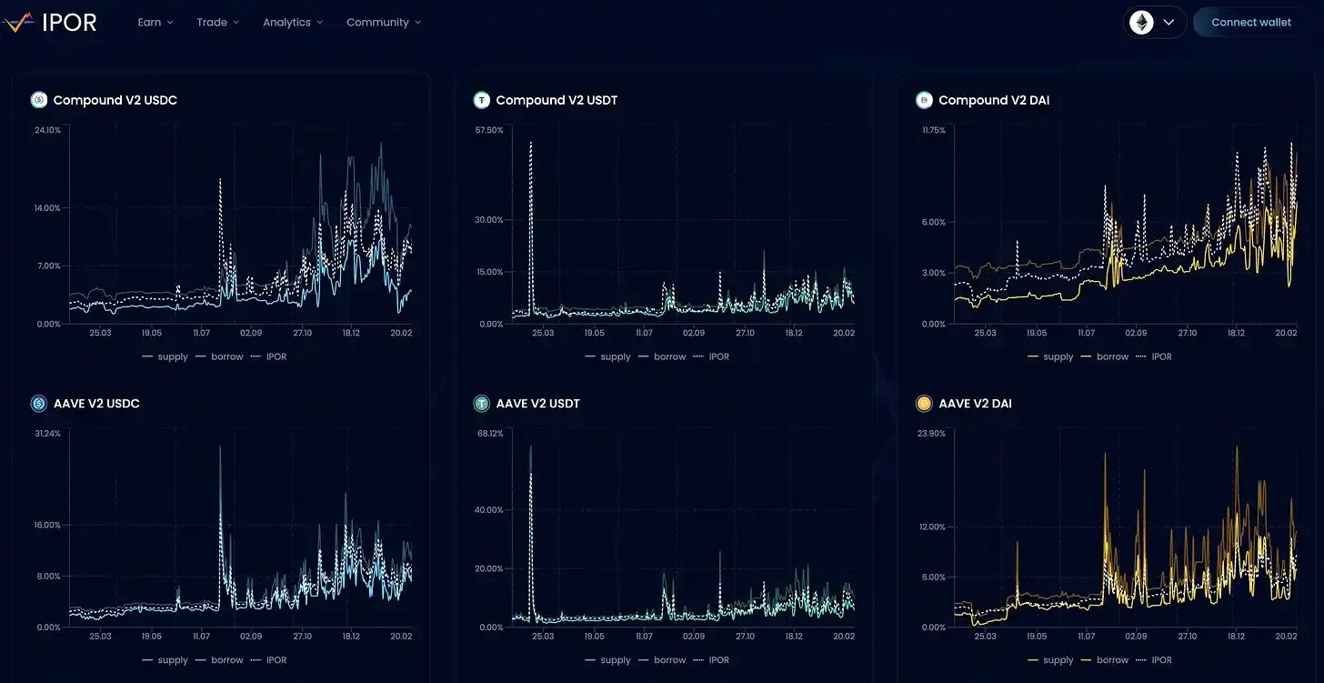 DeFi 的 TVL 达到了 750 亿美元,与 2022 年 11 月 11 日的历史最高水平 1750 亿美元相比,仍有 270% 的差距。然而,在 DeFi 领域,借贷利率正在全面上升。Ipor 的指数显示,借款的年化利率可高达 10% 。