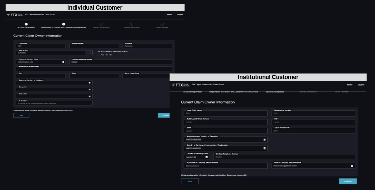 这里需要注意的是,个人客户是指以个人名义对“FTX.com”或“FTX International”提出索赔的客户;机构客户是指以公司名义对“FTX.com”或“FTX International”提出索赔的客户;非客户债权人则是指向 FTX Digital 提供商品或服务的交易债权人(有一小部分员工可能属于这种情况),这三种类型的注册信息并不一样,具体可参加下图: