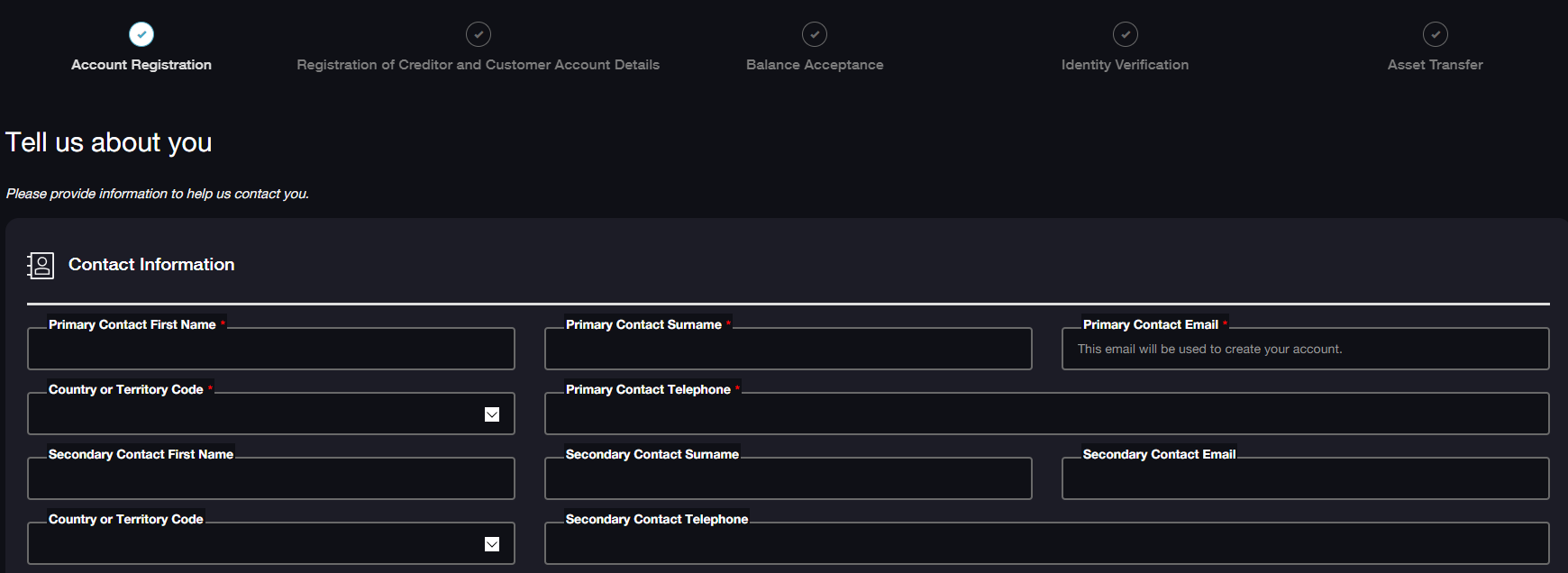 完成登陆之后即可进入到“债权人和客户账户详细信息注册”部分,并输入提供以下详细信息: