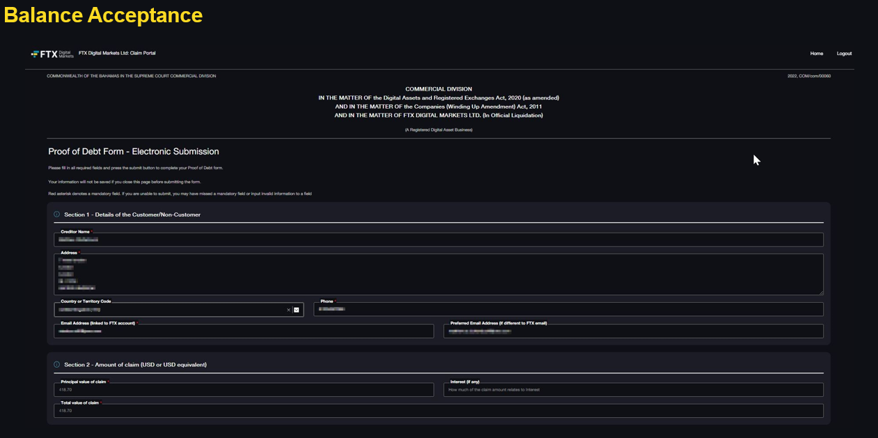 想要提交索赔,还需要填写其他详细信息以将自己注册为债权人,并将 FTX 账户与刚刚创下的 FTX Digital 索赔门户网站账户进行关联。只有当 FTX 账户链接到 FTX Digital 索赔门户账户之后,财可以为 FTX 账户提交一份索赔并查看相关账户余额,之后可以选择接受余额数字,也可以对余额数字提出异议,并提供进一步的详细信息来证实索赔资金金额。