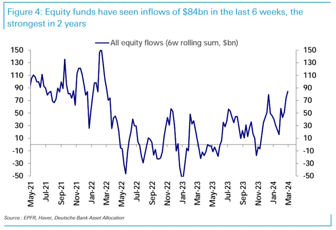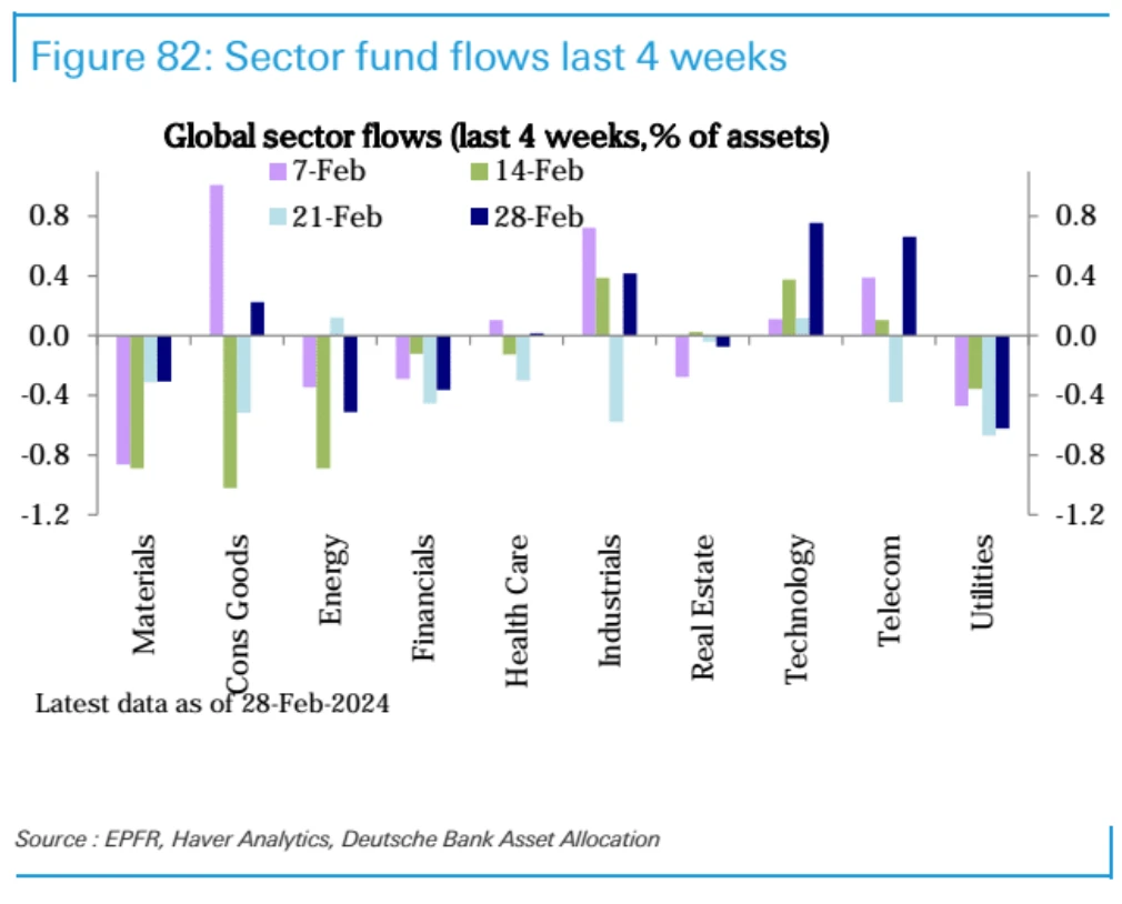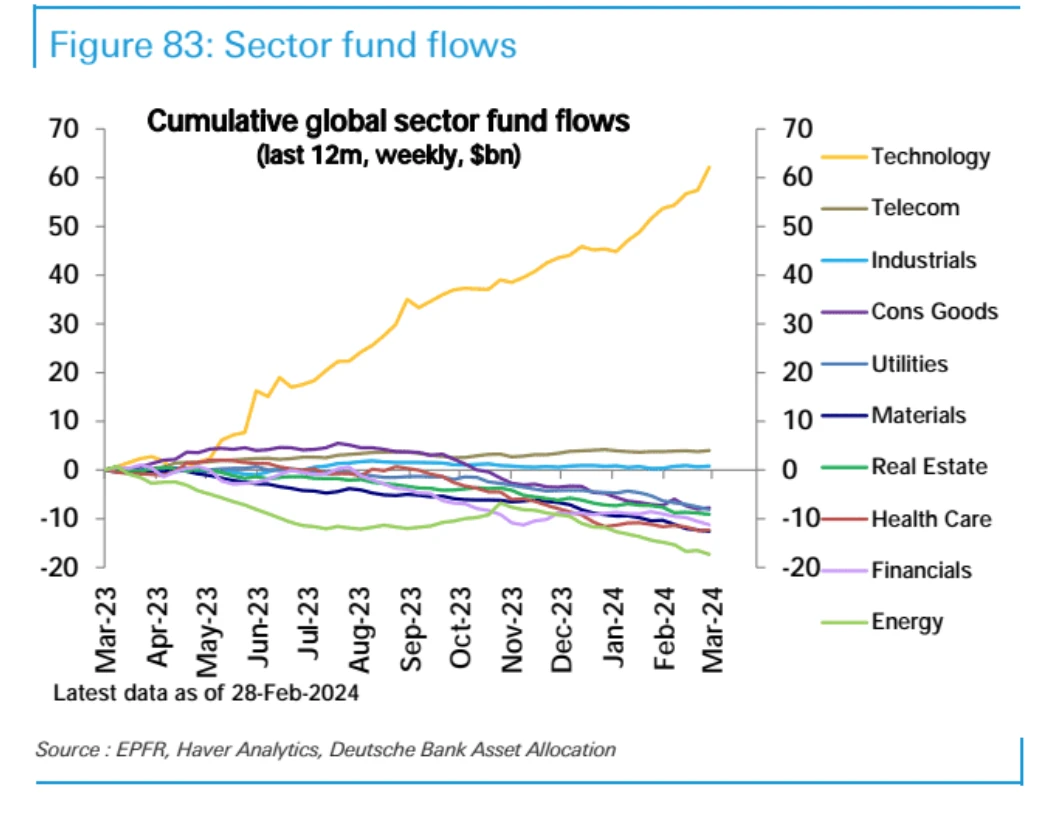 股票基金连续第六周迎来强劲流入 ( 100 亿美金),总流入金额 ( 840 亿美金) 为两年来最高。 其中美国股票基金 ( 113 亿美金) 是流入的主要来源。 科技类基金流入 ( 47 亿美金) 也升至 6 个月来最高。 债券 ( 138 亿美金) 和货币市场基金 ( 387 亿美金) 也录得强劲流入。流入包括苹果和英伟达等大公司在内的科技股的资金流入达到 47 亿美元,创下 8 月份以来的最高水平,并有望创下 988 亿美元的年度纪录。