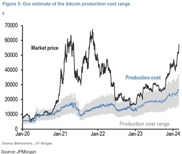 从历史上看,比特币的生产成本一直是其价格下限的关键决定因素。比特币的平均生产成本目前为每枚 26500 美元,减半后将立刻翻倍至 53000 美元。不过减半后网络算力可能下降 20% ,所以可能会将估计的生产成本和价格降低至 42, 000 美元。这一价格也是 JPM 预测 BTC 可能回调的最低点。