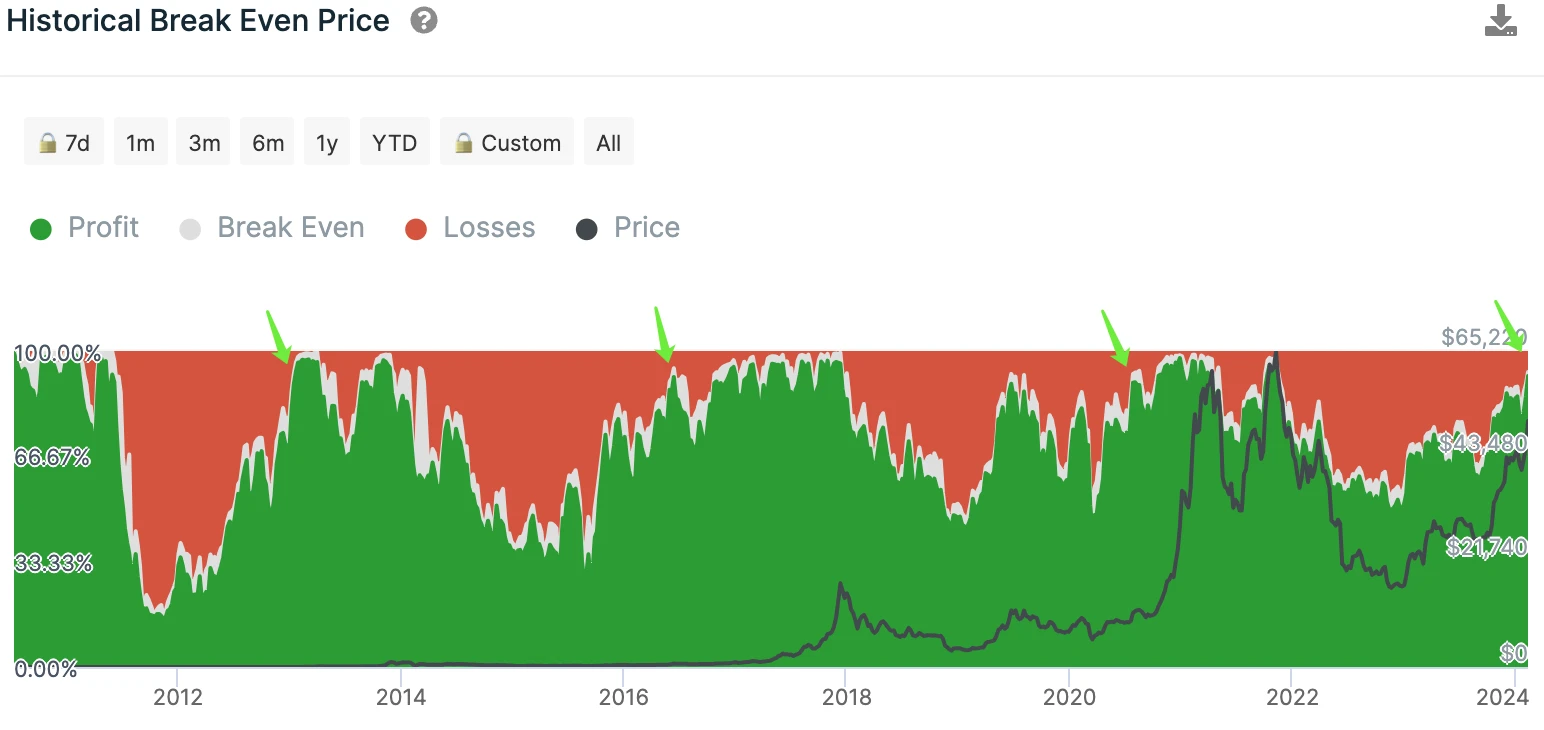 上次我们观察到如此大比例的盈利地址时,比特币的价格约为 69, 000 美元,接近历史最高点。