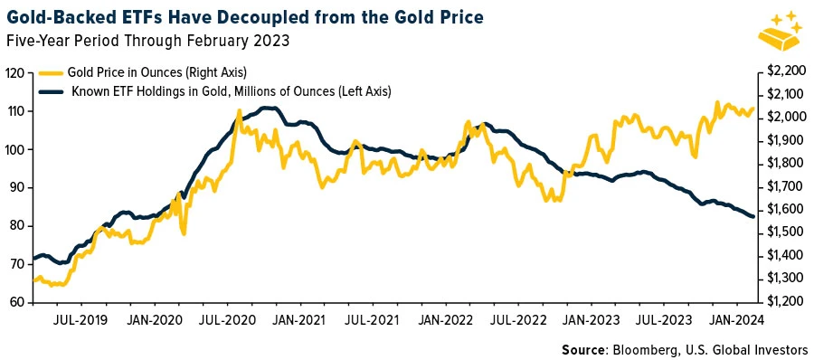 目前还不清楚围绕比特币的兴奋是否正在吸走黄金的资金,但黄金的价格走势和投资水平之间似乎确实存在一些脱节,这种脱节已经持续了 1 年以上。从历史上看,黄金价格和黄金支持的 ETF 持有量一直同步交易,但从 2023 年开始,两者开始脱钩,如下所示。这可能是由多种因素造成的,包括投资者情绪的变化、货币政策、投资组合平衡、货币波动等。