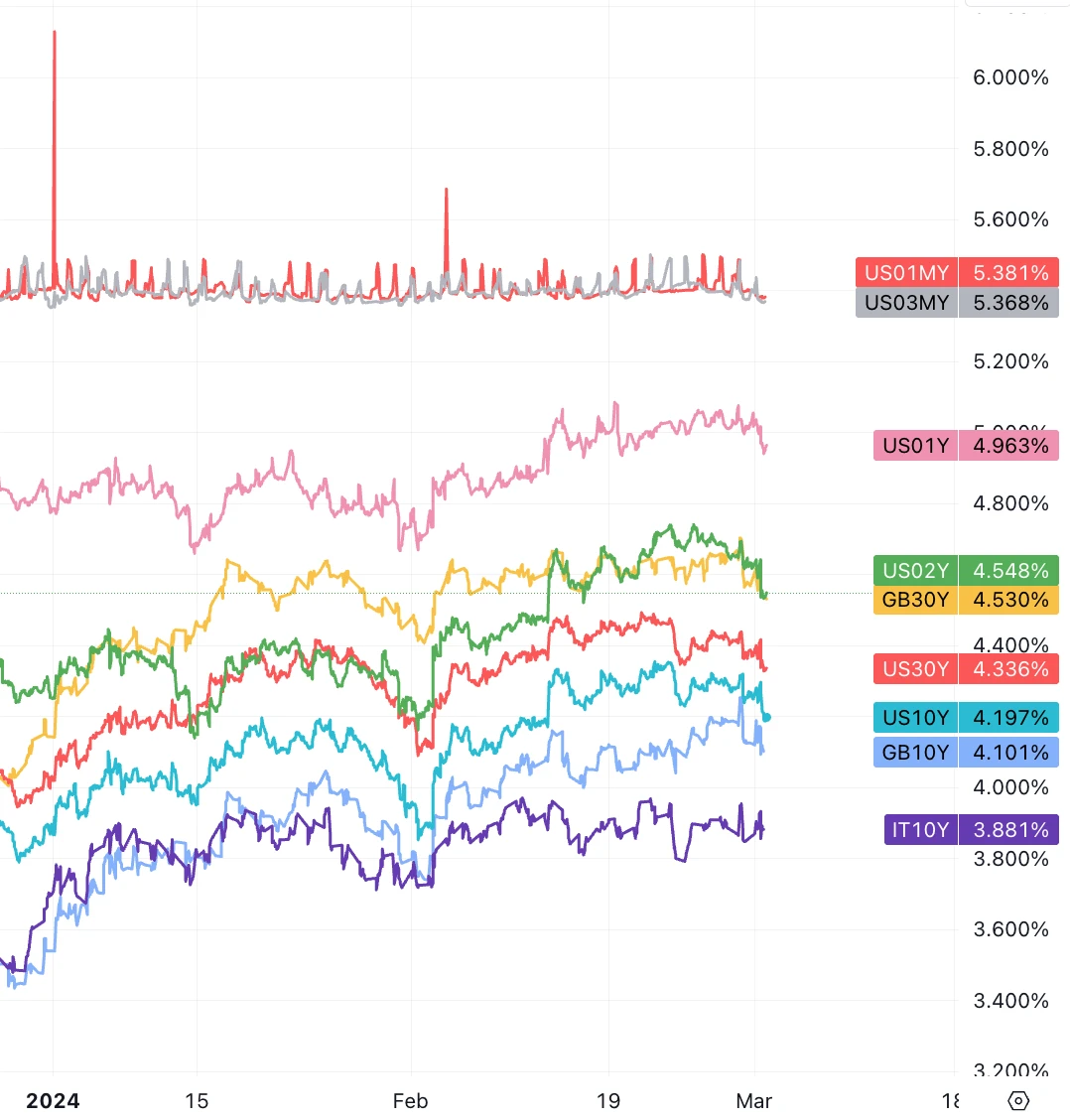 2 月份可以看出来,如果债市收益率上升的原因是积极因素(经济增长强劲而不是美联储加息),股市在这种环境下就能表现良好。尽管利率上升,上个月标准普和纳指上涨 5% 左右,而且全球股市也创出历史新高,全球多个主要股指创下历史新高,包括德国、法国 、日本。芯片股大幅上涨,NVIDIA 又又又涨了 30% ,AMD 涨 20% ,博通和 TSMC 涨 17% 。芯片股的逻辑还是越接近 AI 产业链上游的涨的越多,至于下游软件公司尤其是大科技表现一般,例如谷歌过去一个月跌 4% ,苹果跌 2.4% ,微软涨 3% ,Meta 因为 500 亿回购涨 27% 。原油价格小幅上涨 WTI 接近 80 美元。美元指数先涨后跌基本走平。比特币和以太坊涨了近 50% 。