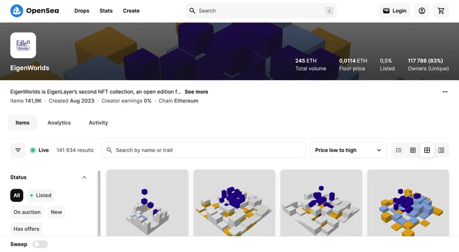 EigenLayer 是一种总锁定价值 (TVL) 超过 50 亿美元的重质押协议,推出了两个迷人的 NFT 系列:EigenLayer World Builders 和 EigenWorlds。每个都为广阔的 EigenLayer 生态系统做出了独特的贡献。目前地板价在 0.0114 ETH。