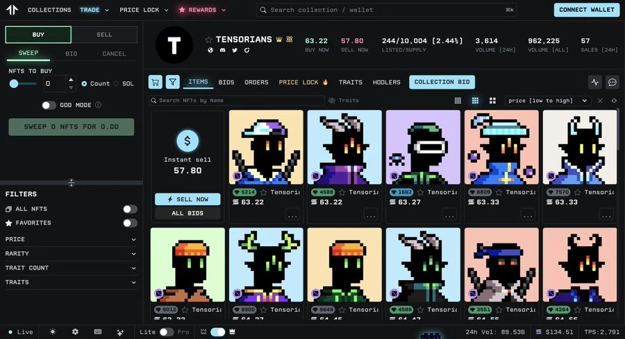 该市场的独家 NFT 系列 Tensorians 不仅为持有者提供了接收 Tensor 代币的可能,而且还为 Solana 生态系统内外的未来奖励开辟了前景,目前 NFT 地板价为 66.31 Sol。