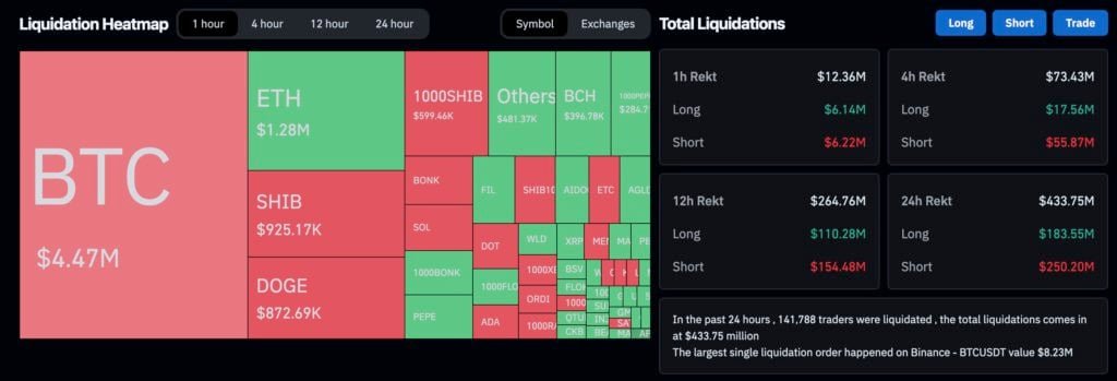 在比特币冲破 6.8 万美元的状况下,据 Coinglass 数据 显示,过去 24 小时,加密货币全网爆仓金额超过 4.3 亿美元(空投占多数),有超 14.1 万人遭清算。