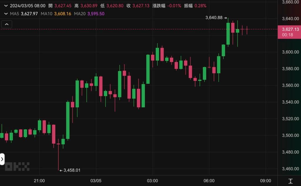 以太坊(ETH)也同样拉涨,稍早最高来到 3,640 美元,同样刷新今年新高。
