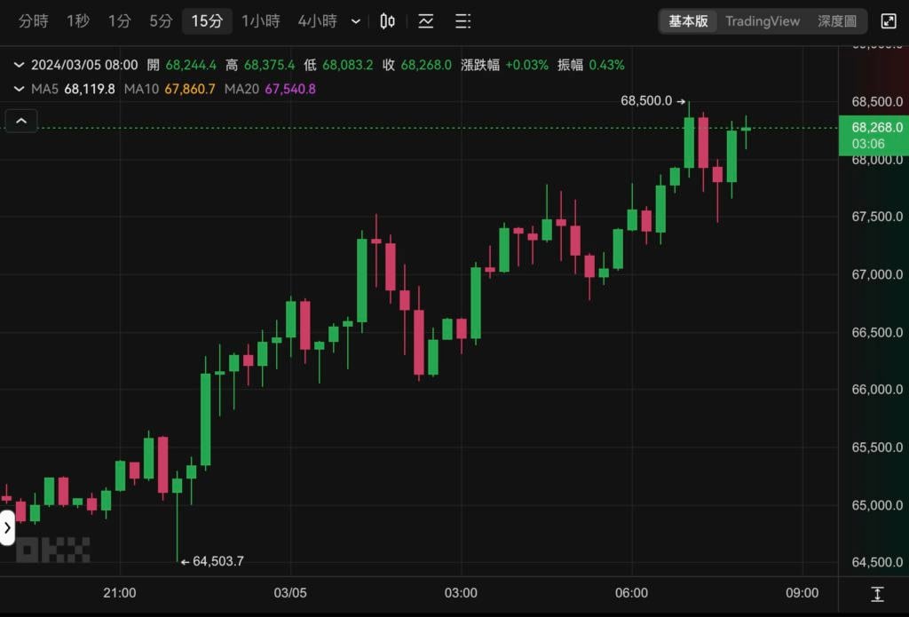 台 湾时间今(5)日 07:00,比特币最高触及 68,500 美元,近 24 小时上涨近 8%,距离历史高点 6.9 万美元仅差 500 美元,让市场投资者期待很快我们就会看到 BTC 再创历史新高。