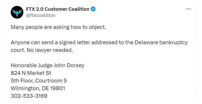 FTX 2.0 债权人联盟也呼吁写信给法官,反对此提议。