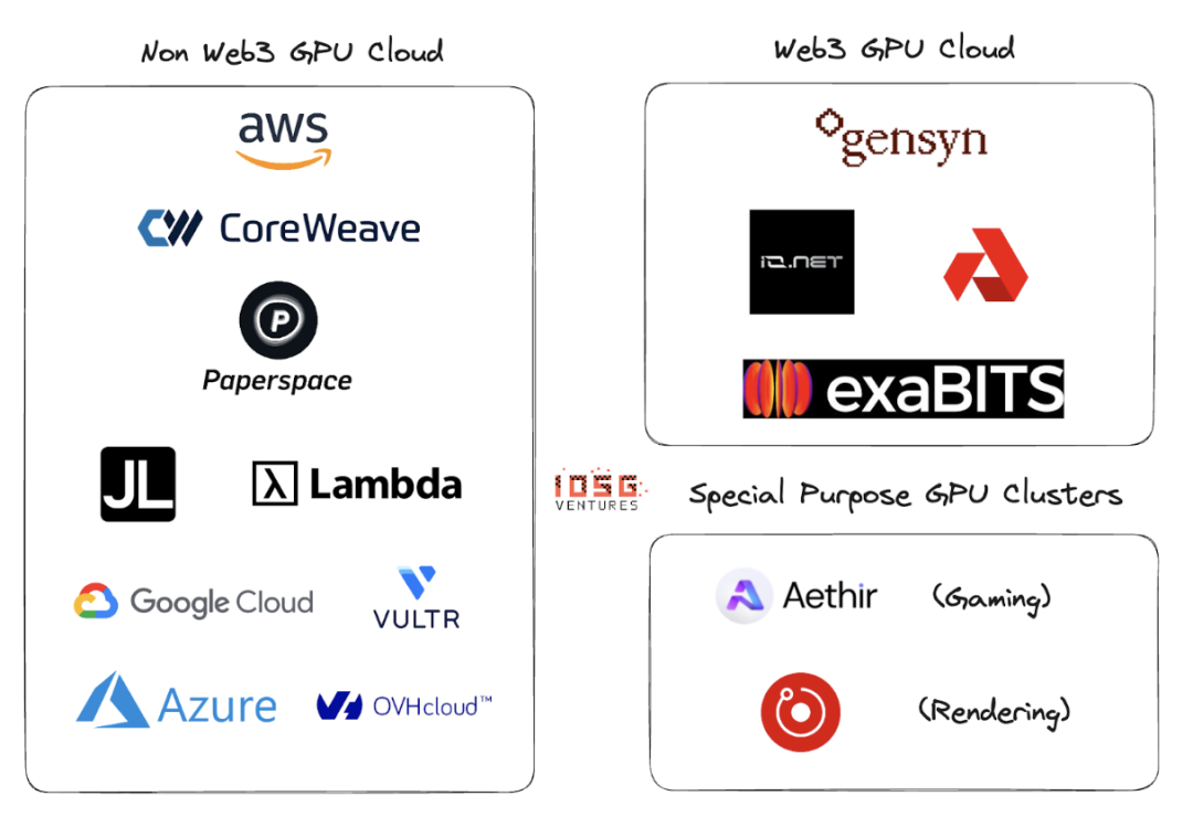 Web2在 GPU 云或 GPU 即服务领域有很多参与者。这一领域的主要玩家包括 AWS、CoreWeave、PaperSpace、Jarvis Labs、Lambda Labs、谷歌云、微软 Azure 和 OVH 云。