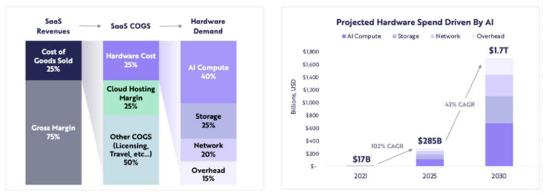 计算相关硬件支出预计将从 2021 年的 170 亿美元增长到 2025 年的 2850 亿美元(约 102% 的复合年增长率),ARK 预计到 2030 年计算相关硬件支出将达到 1.7 万亿美元(43% 的复合年增长率)。