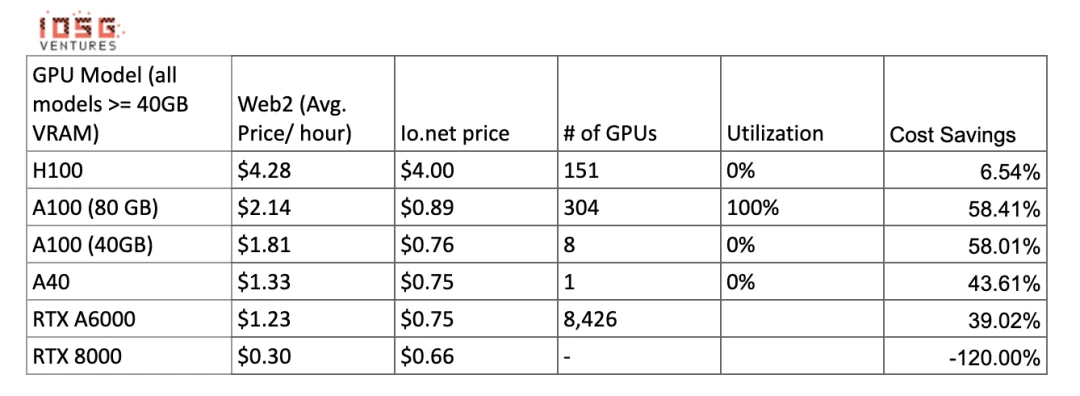 当有更多供应和利用集群提供这些 GPU 时,这些数字可能会发生变化。Gensyn 声称以低至每小时 0.55 美元的价格提供 A 100 s(及其等价物),Exabits 承诺类似的成本节省结构。