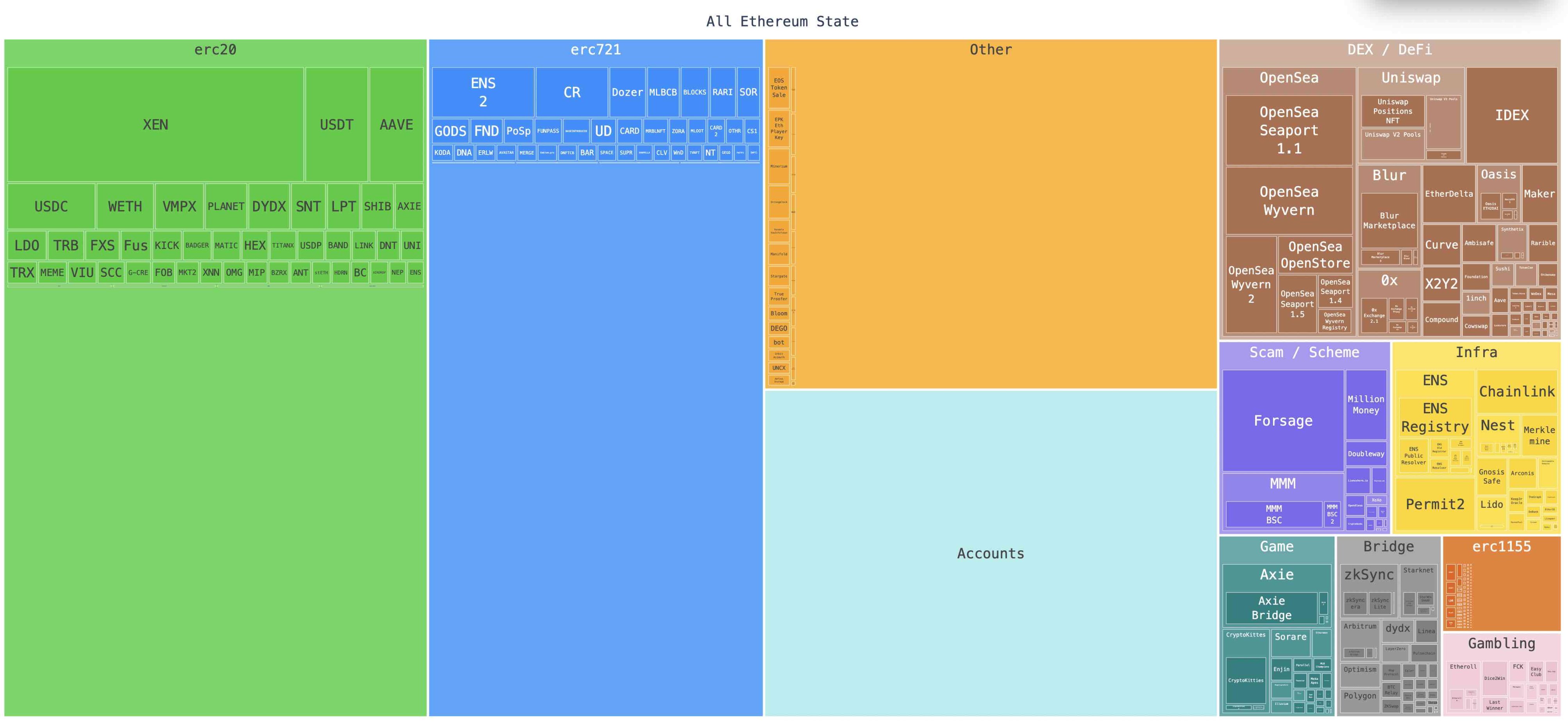 代币是状态的最大贡献者。以太坊状态的最大贡献者是 ERC-20 和 ERC-721 代币,分别占据状态的 27.2% 和 21.6% 。代币之所以占用如此多的状态,是因为每个代币的每个用户余额必须单独存储在自己的 32 字节存储槽中。因此,以太坊状态规模的一半与以太坊用户总数和每个用户持有的代币总数成比例。