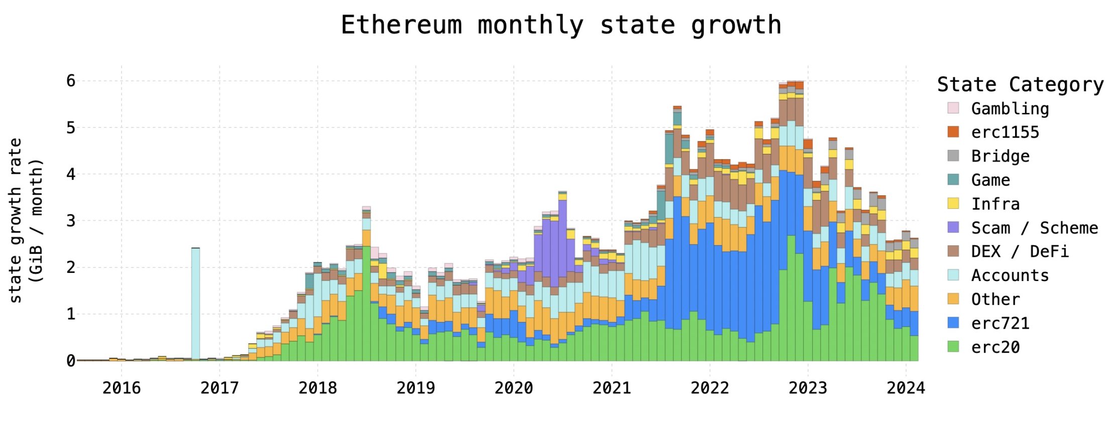 状态增长:新账户、新合约字节码、新合约存储的积累。