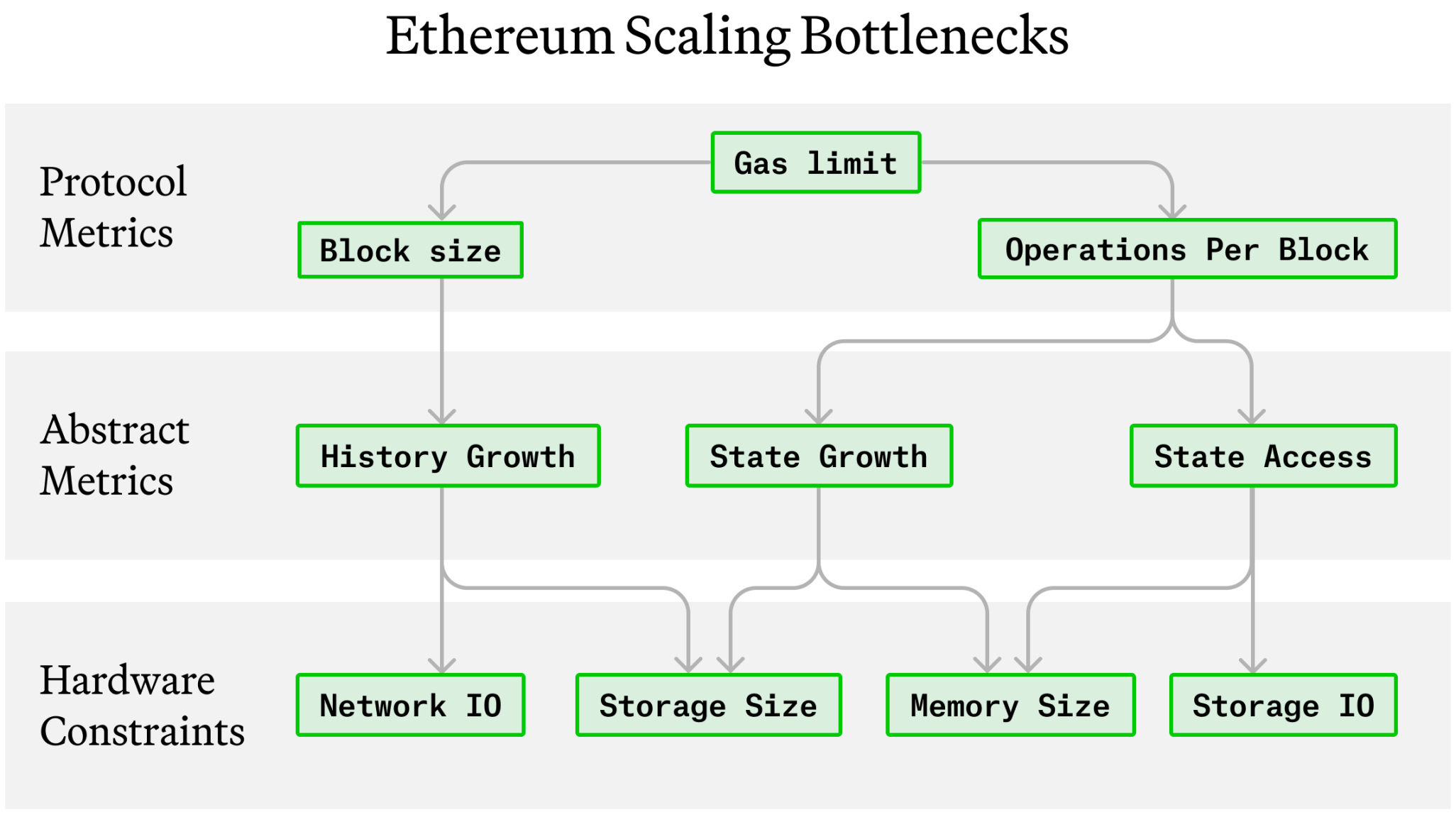 从图的顶部开始,每次以太坊执行交易时,该交易使用的所有资源都以 Gas 定价。因此,以太坊的 Gas 限制是一个单维量,它对所有形式的链上活动进行速率限制。 Gas 限制的下游是区块大小和每个区块的操作。每个区块的字节越多,历史记录增长得越快。每个区块的 IO 操作越多,状态访问率越大,并且(通常)状态增长率也越大。