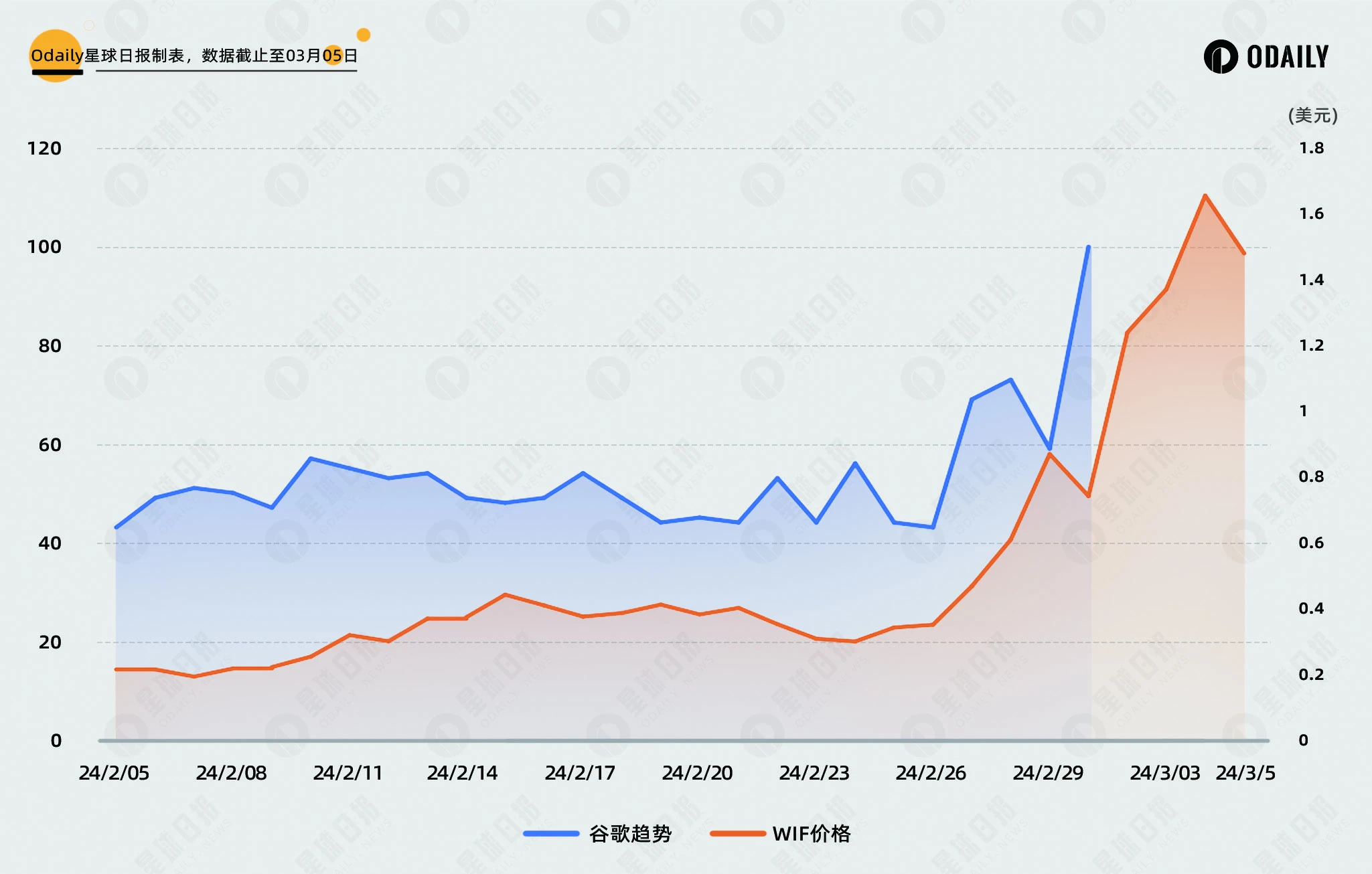 WIF 近一个月的价格与社媒搜索数据如下,国内对其没有明显的关注变化,值得注意的是,在 3 月 5 日 18 时 ,即币安公布上线 WIF 现货之后, 热度开始飙升 ,出现了类似 PEPE 的偏离情况。