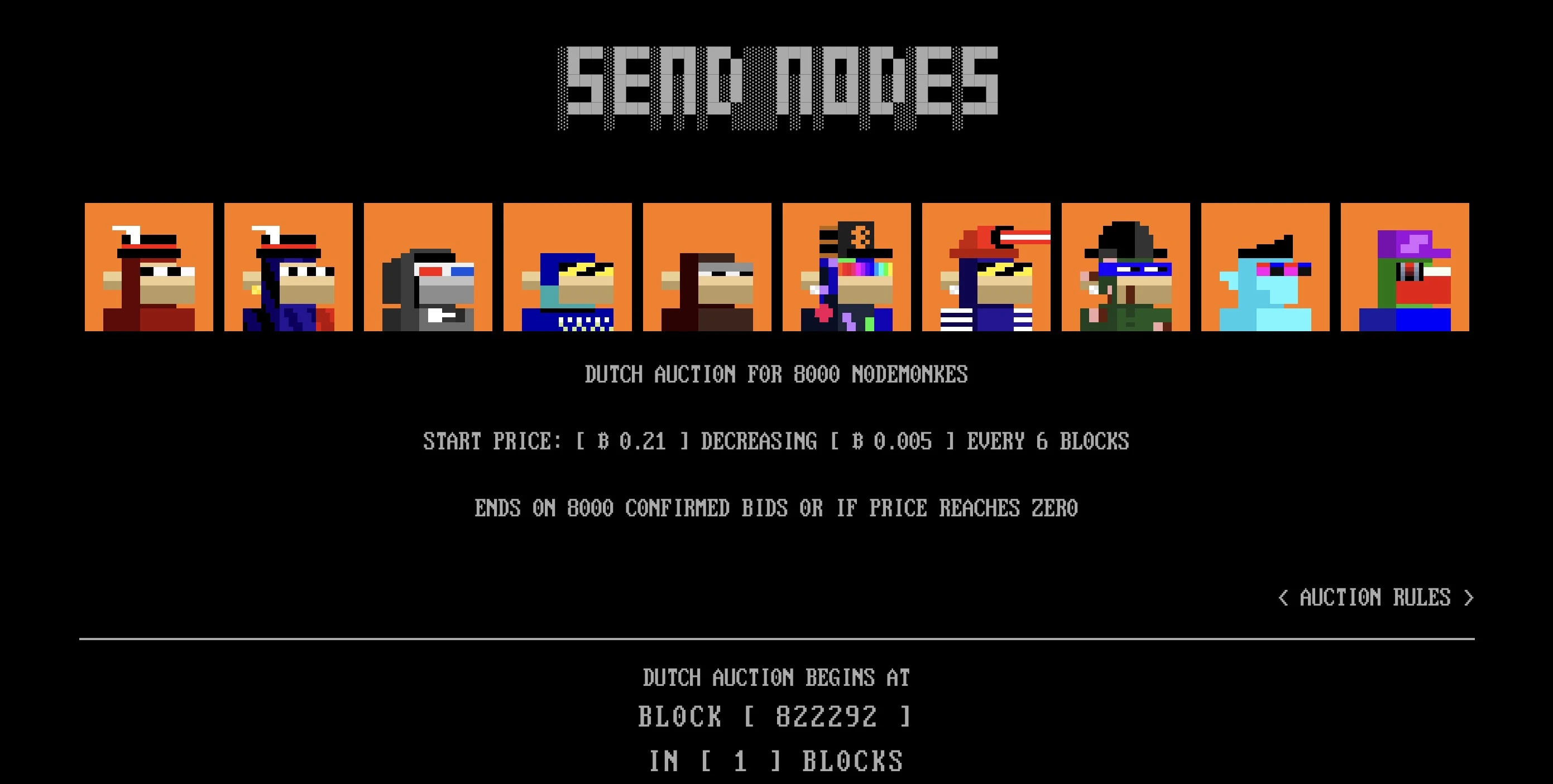 NokeMonkes 发售时,nodetoshi 采用荷兰拍价格递降的方式 拍卖了 8000 个 NFT,起始拍卖价格 0.21 BTC。在经历了约 30 个小时的荷兰拍之后,最终在价格下降到 0.04 BTC 左右全部售罄。剩余的 NokeMonkes,其中 1000 个用于社区、贡献者、艺术家、开发者等;另外 1000 个为创始人团队自留,并已公开相关钱包地址。