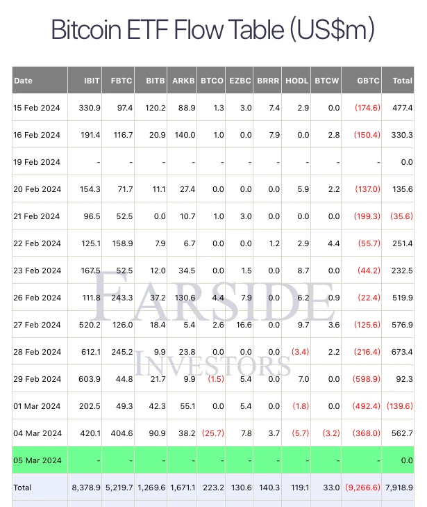 Farside Investors 数据,自 1 月 11 日 ETF 获批并上线以来,十大比特币现货 ETF(包含 GBTC)得历史累计净流入已超 79.18 亿美元,其中贝莱德的 IBIT 和富达的 FBTC 为流入主力,分别流入 83.78 亿美元和 52.19 亿美元,彻底对冲并消耗掉了 GBTC 的 92.66 亿美元净流出。