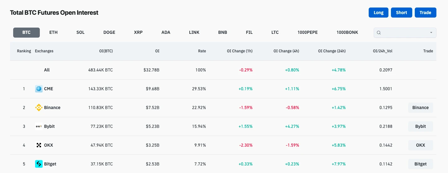 Coinglass 数据显示,全网 BTC 期货合约未平仓头寸已达到 48.344 万枚 BTC,约合 327.8 亿美元, 24 小时增幅为 4.87% 。