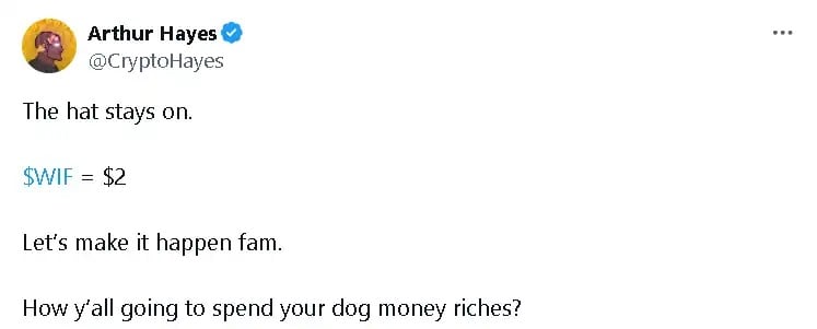 因此,WIF 也顺利突破 1 美元,Coinbase 将其评为第一个突破 1 美元的狗狗币。随后,3 月 2 日,Arthur Hayes 也再次发推表示看涨 WIF,认为其能涨破 2 美元。