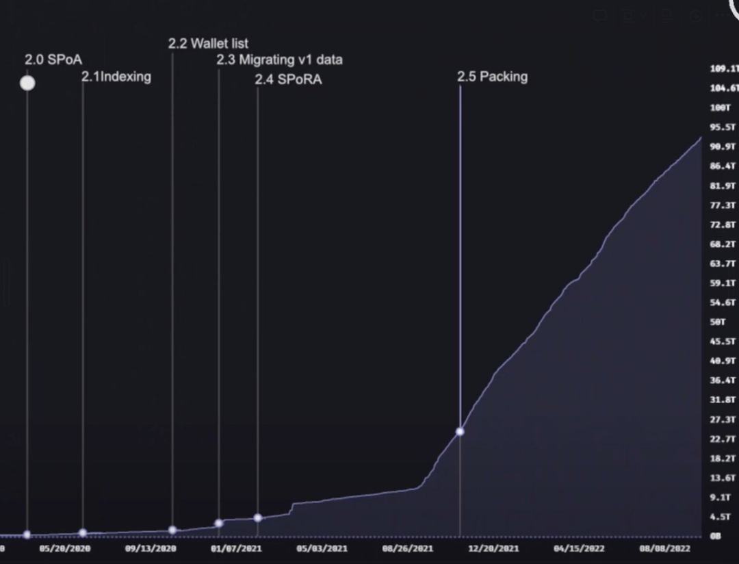图 1:近 6 年中 Arweave 编织网络(weave)大小随时间变化的曲线图以及版本迭代