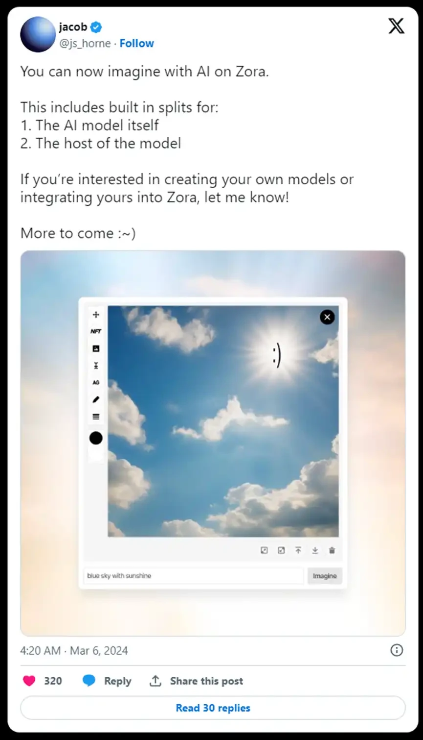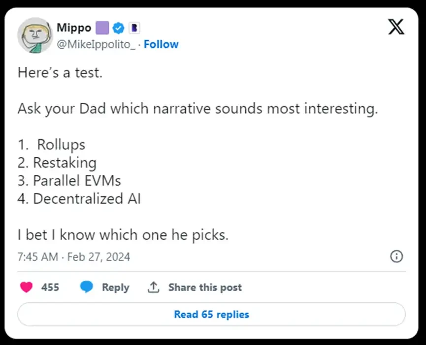我想我们会在 2024 年听到很多「去中心化人工智能」这个词。这个非常简单的 meme 在一个非常简单的短语中包含了大量的信息和含义,「人工智能,但为了人」。