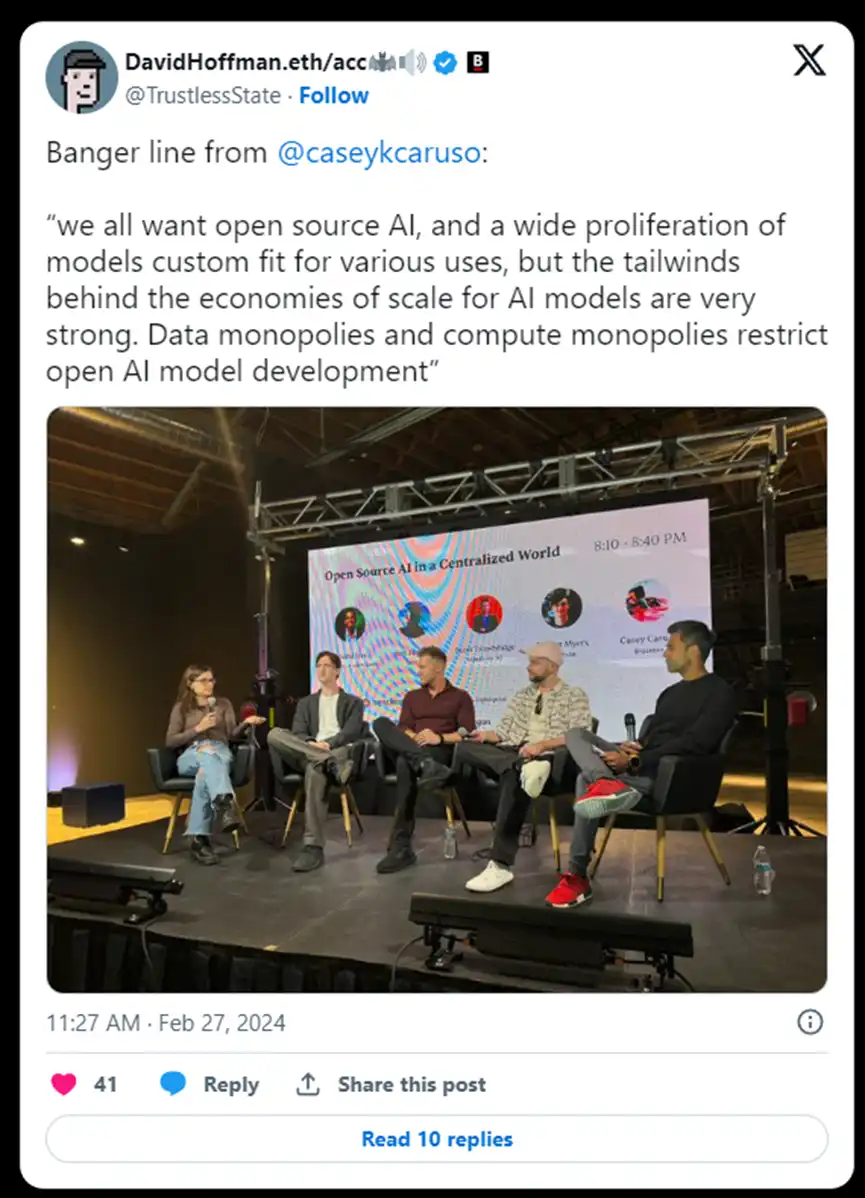 「我们都想要开源的人工智能,以及适合各种用途的定制模型的广泛扩散,但人工智能模型规模经济背后的推动力非常强大。数据垄断和计算垄断限制了开放人工智能模型的发展。」