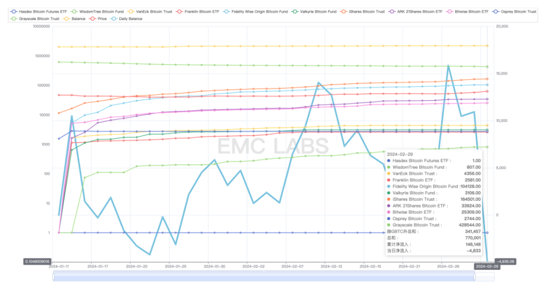 2 月,ETF 通道资金会同稳定币通道资金一起推动 BTC 大涨 43.79% 。11 支 ETF BTC 主购平台 Coinbase 的 BTC 存量持续下降,仅余 393241 枚。如此持续,将很快遭遇流动性危机。