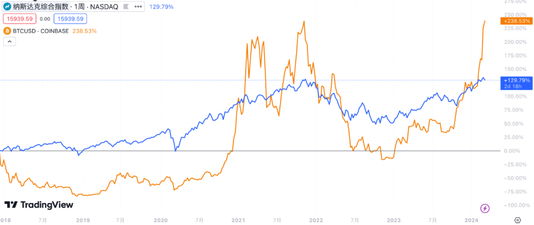 BTC vs NASDAQ 走势(周线)